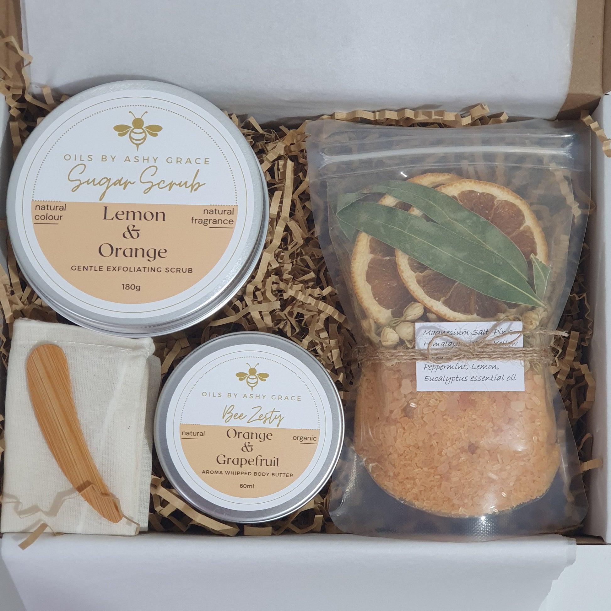 Our Bee Zesty Gift Box brings together three revitalising favourites — a sugar scrub, a silky body butter, and refreshing bath salts — all infused with the crisp, uplifting aroma of peppermint, eucalyptus, and citrus.